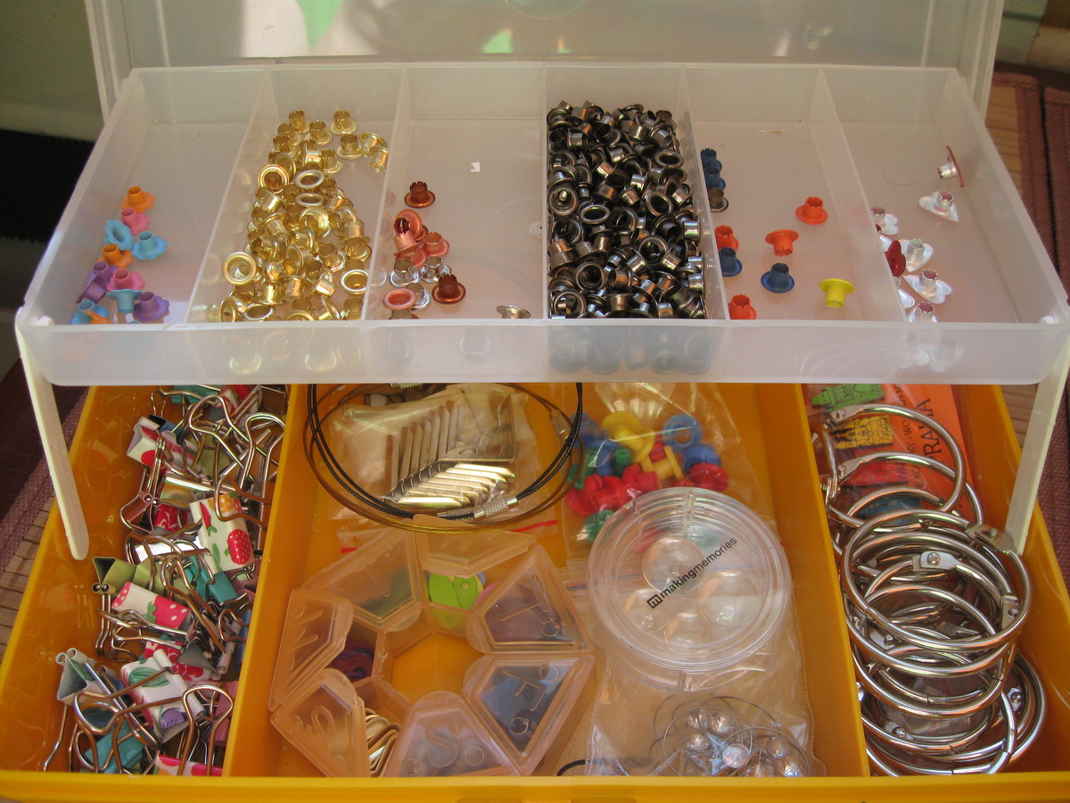 ... коробка с люверсами, кольцами для альбомов, анкерами, скрепками и прочим: